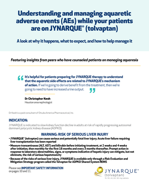 Adverse Reactions: Most common observed adverse reactions with JYNARQUE (incidence >10% and at least twice that for placebo) were thirst, polyuria, nocturia, pollakiuria and polydipsia.
