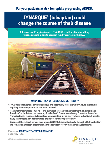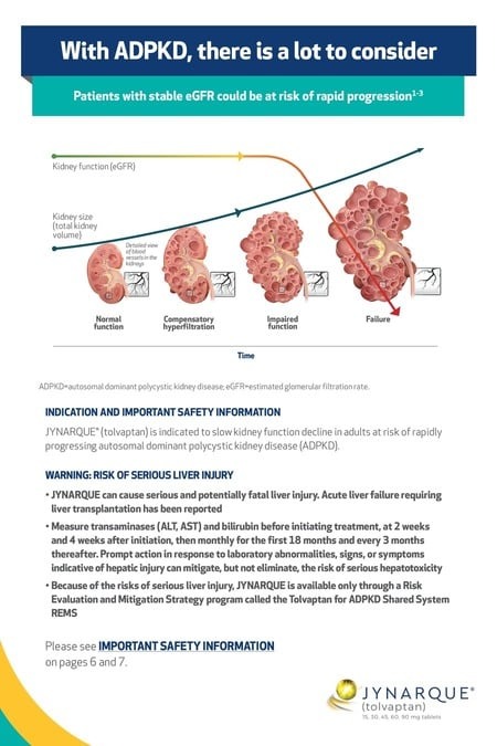 JYNARQUE is indicated to slow kidney function decline in adults at risk of rapidly progressing autosomal dominant polycystic kidney disease (ADPKD).